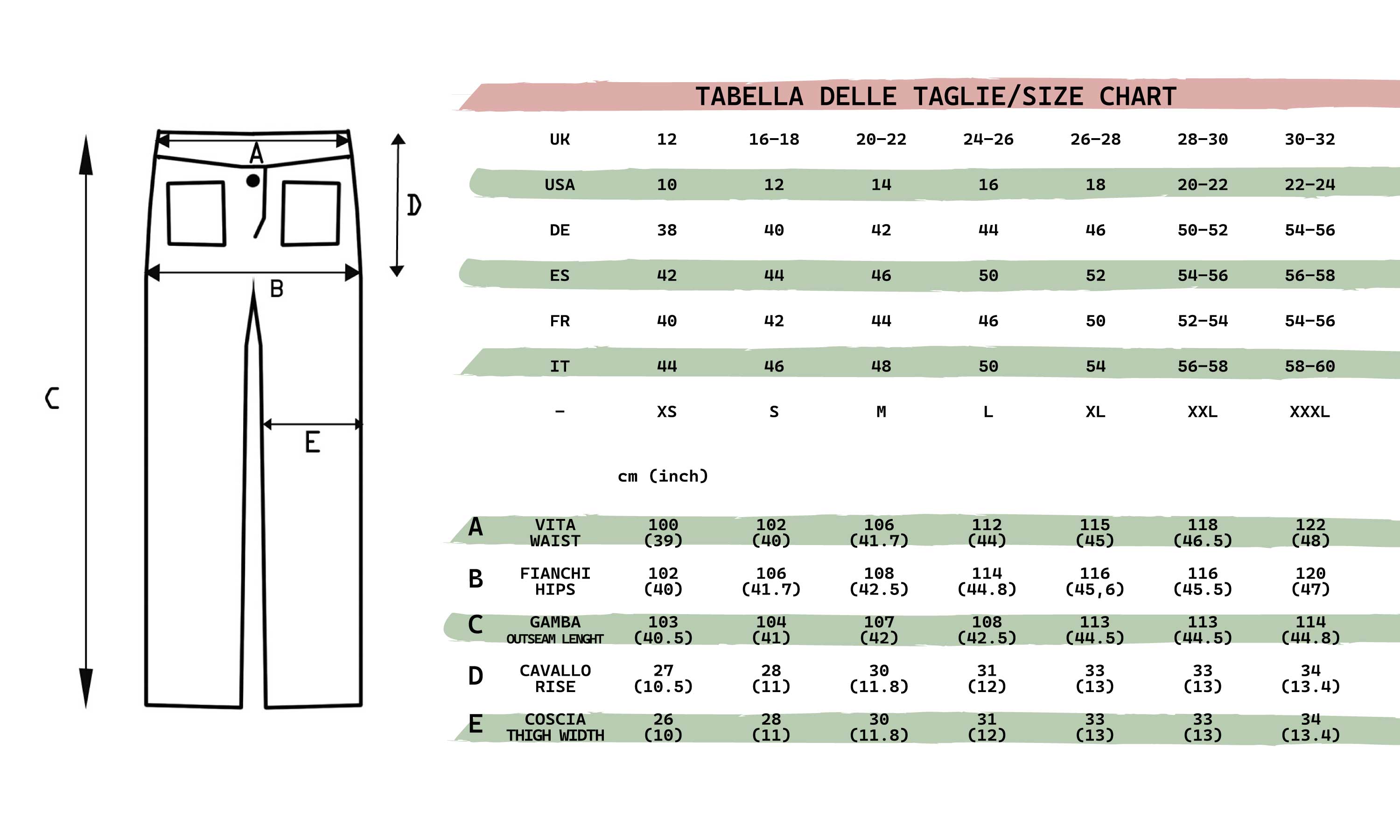In molti capi abbiamo riportato le misure in centimetri di ogni singola taglia,( per es: S = 90cm, riferito a una giacca, sono i cm del giritorace, riferito ai pantaloni sono i cm del girovita ) in questo caso non seguire le indicazioni della tabella che troverai qui sotto, ma affidati ai dati di ogni singolo prodotto per scegliere la taglia corrispondente.