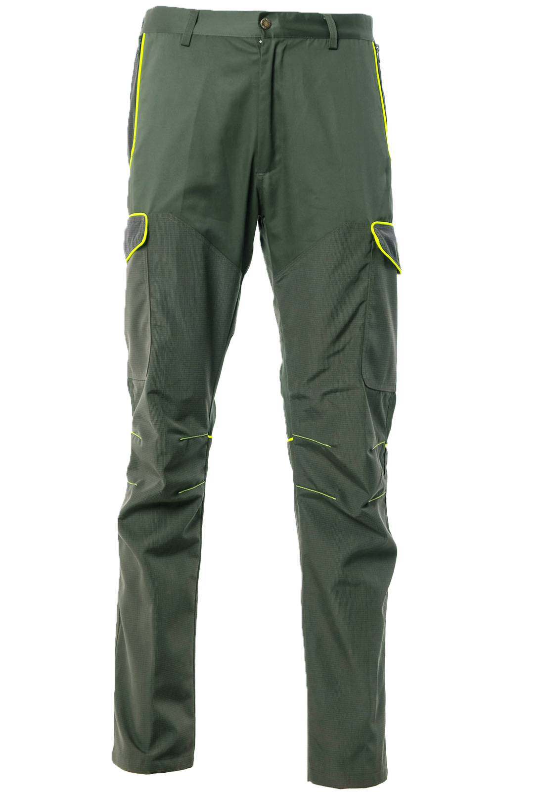 Pantalone uomo caccia antistrappo 6 tasche con rivestimento in tessuto tecnico verde con profilo Giallo alta visibilita dalla 46 alla 60