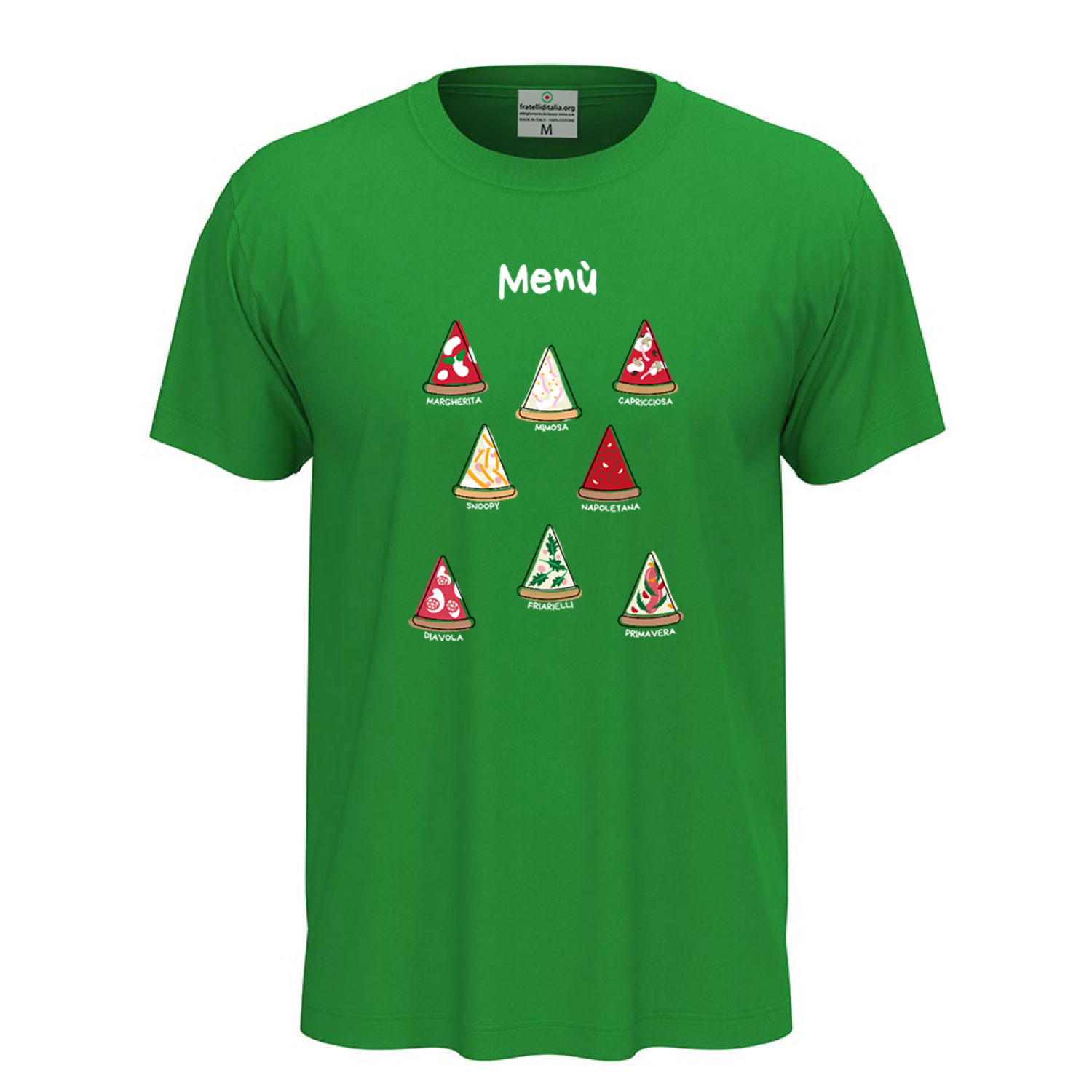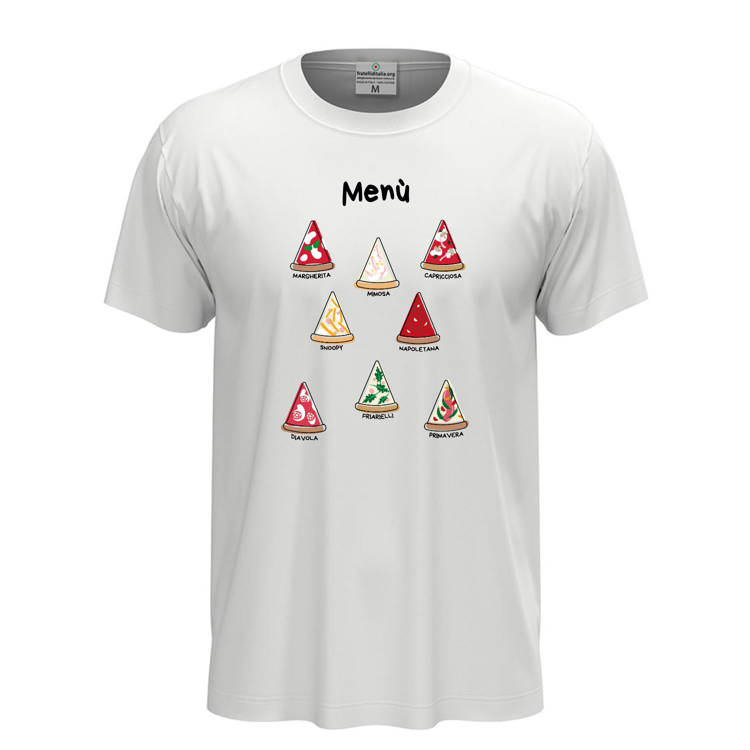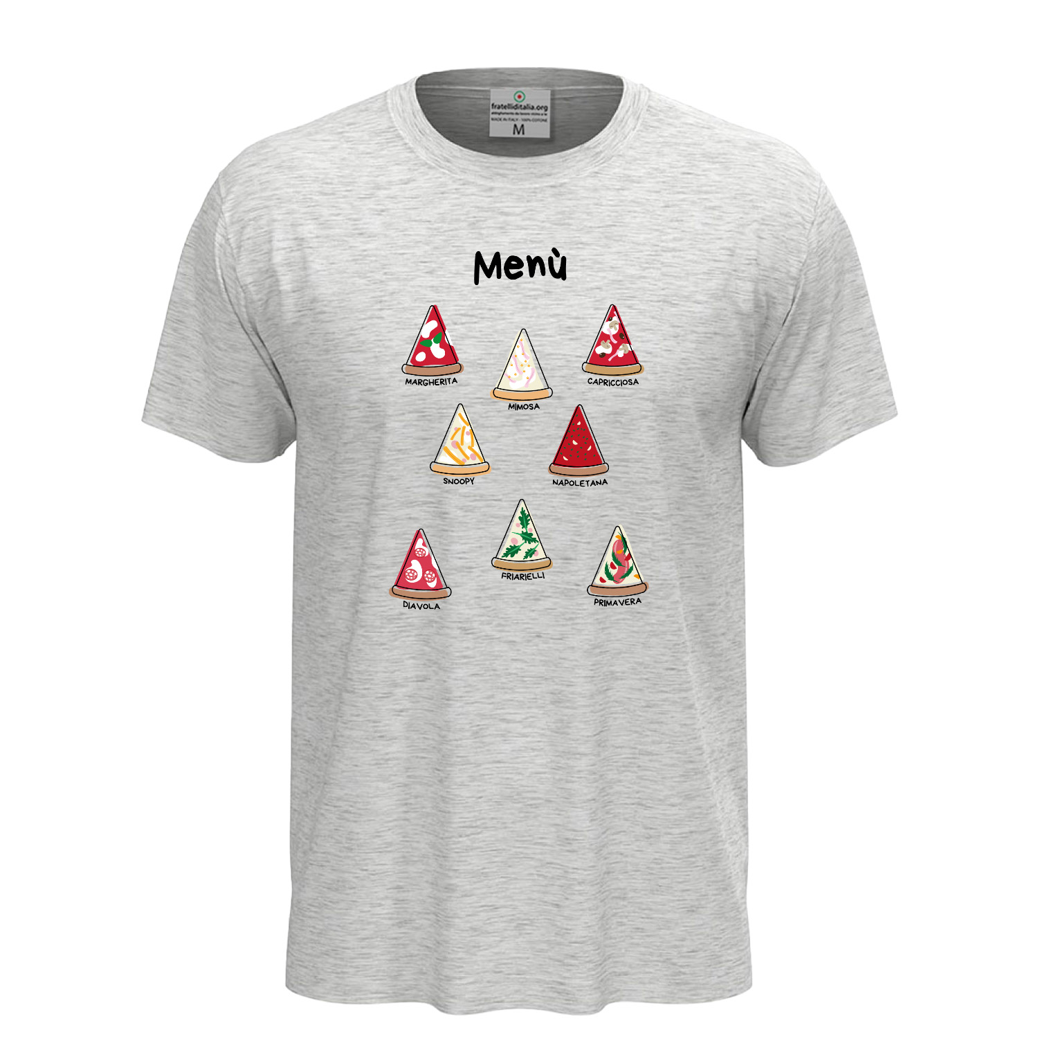 Unisex short-sleeve T-shirt with DTF digital print "Pizza Menu," designed for pizza lovers. Made from 100% ring-spun cotton (85% cotton and 15% viscose for the GYH variant) with lightweight 155 g/m² jersey fabric. Crafted for ultimate comfort with a removable label. Available in sizes XS to 5XL. High-quality DTF print ensures sharp and long-lasting details. Machine washable at 30°C; turning it inside out is recommended to preserve the print.