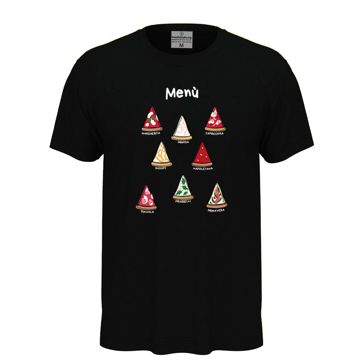 T-shirt unisex a manica corta con stampa digitale DTF "Menù Pizza," pensata per gli amanti della pizza. Realizzata in 100% cotone filato ad anelli (85% cotone e 15% viscosa per la variante GYH), con un tessuto in jersey semplice e un peso di 155 g/m². Progettata per offrire massimo comfort grazie all’etichetta rimovibile. Disponibile in un'ampia gamma di taglie dalla XS alla 5XL. Stampa DTF di alta qualità per un design nitido e resistente. Lavabile in lavatrice a 30°C; si consiglia il lavaggio al rovescio per preservare la stampa.